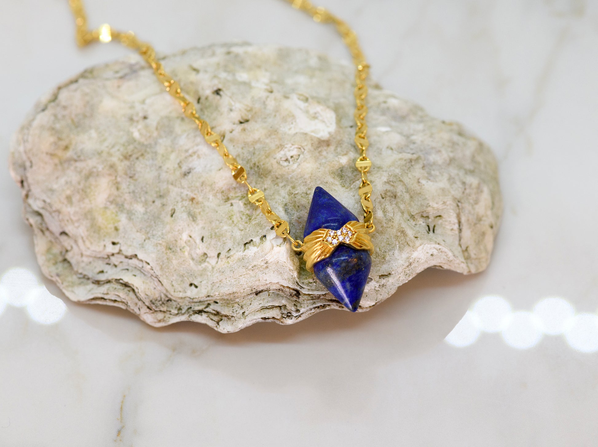 Håndlaget i 24K gullbelagt sølv (vermeil) dekorert med glitrende zirkonia og et anheng i dyp blå Lapis Lazuli
