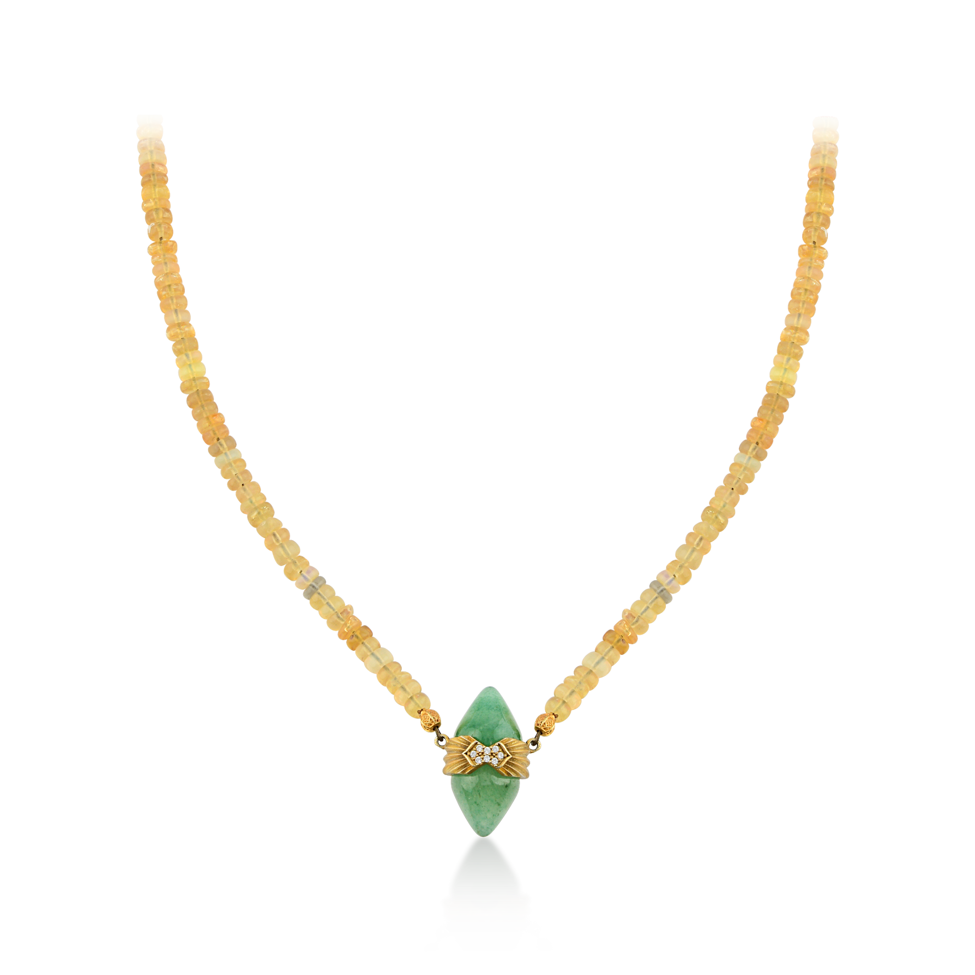 De glitrende opalene rundt halsen skaper en magisk glød, som stjerner fanget i gull. Den grønne steinen minner om nordlysets dans-vakker sjelden og helt unik.