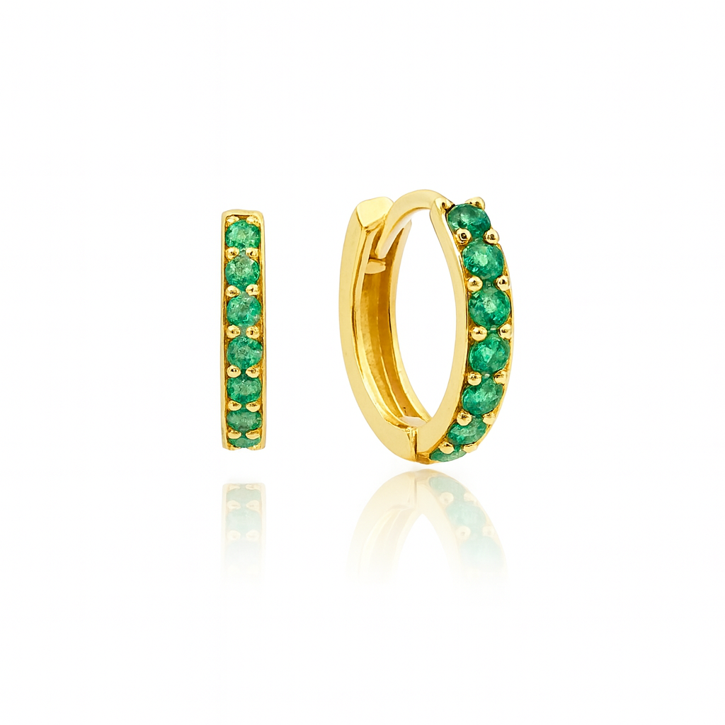 Delikate hoops i sølv, belagt med et tykt lag 24K gull og pyntet med nydelige grønne zirkonia. Diameter 1 cm.