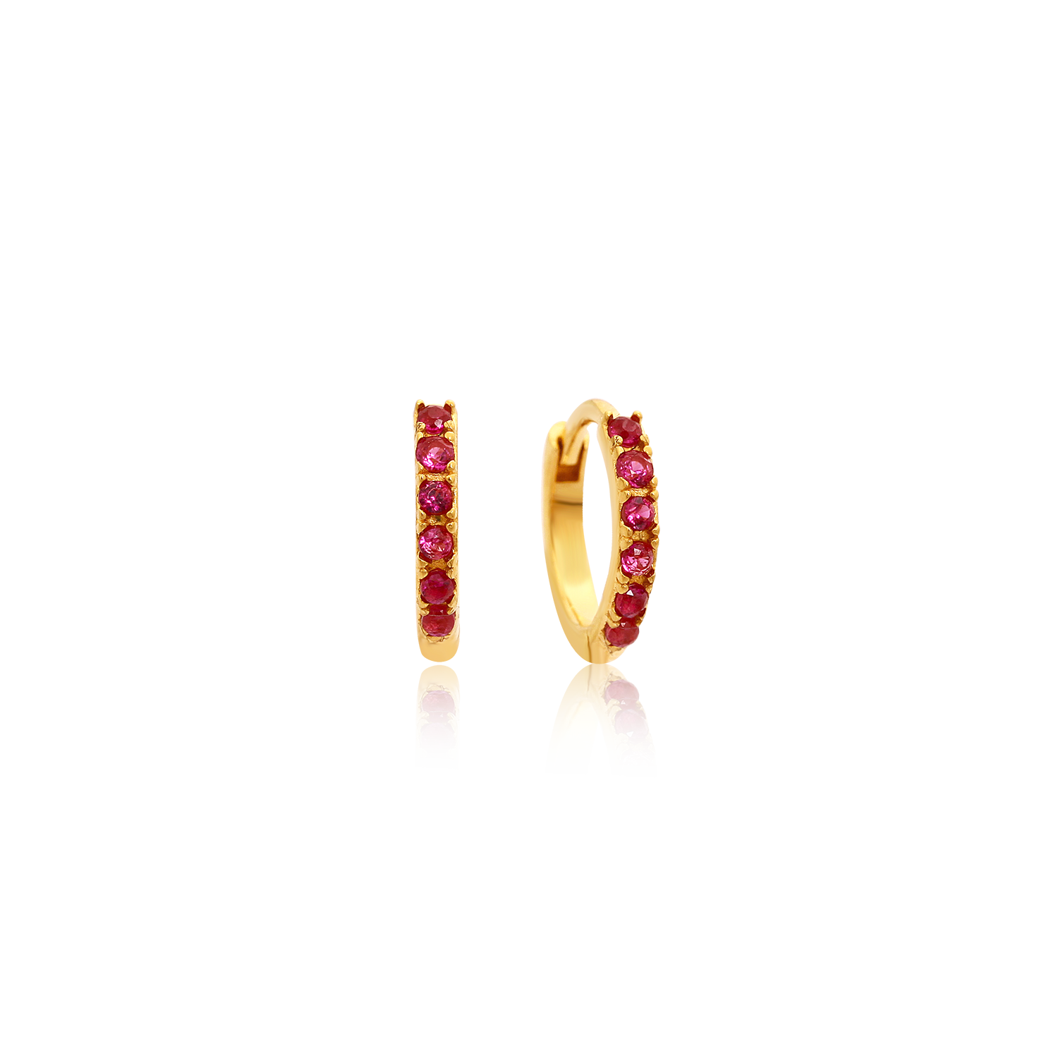 Vermeil 24K . Øreringen er pyntet med vinrød zirkonia. Øreringene er 1 cm i diameter.