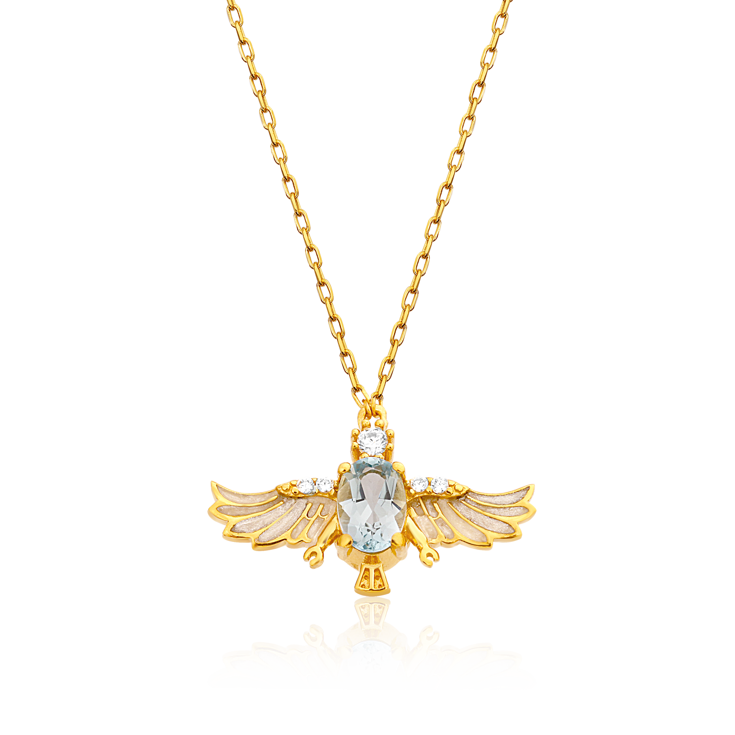 Halskjede i 24 K belagt sølv, vermeil med anheng formet som en føniks. Pyntet med himmelblå topas og glitrende zirkonia, 44 cm langt.