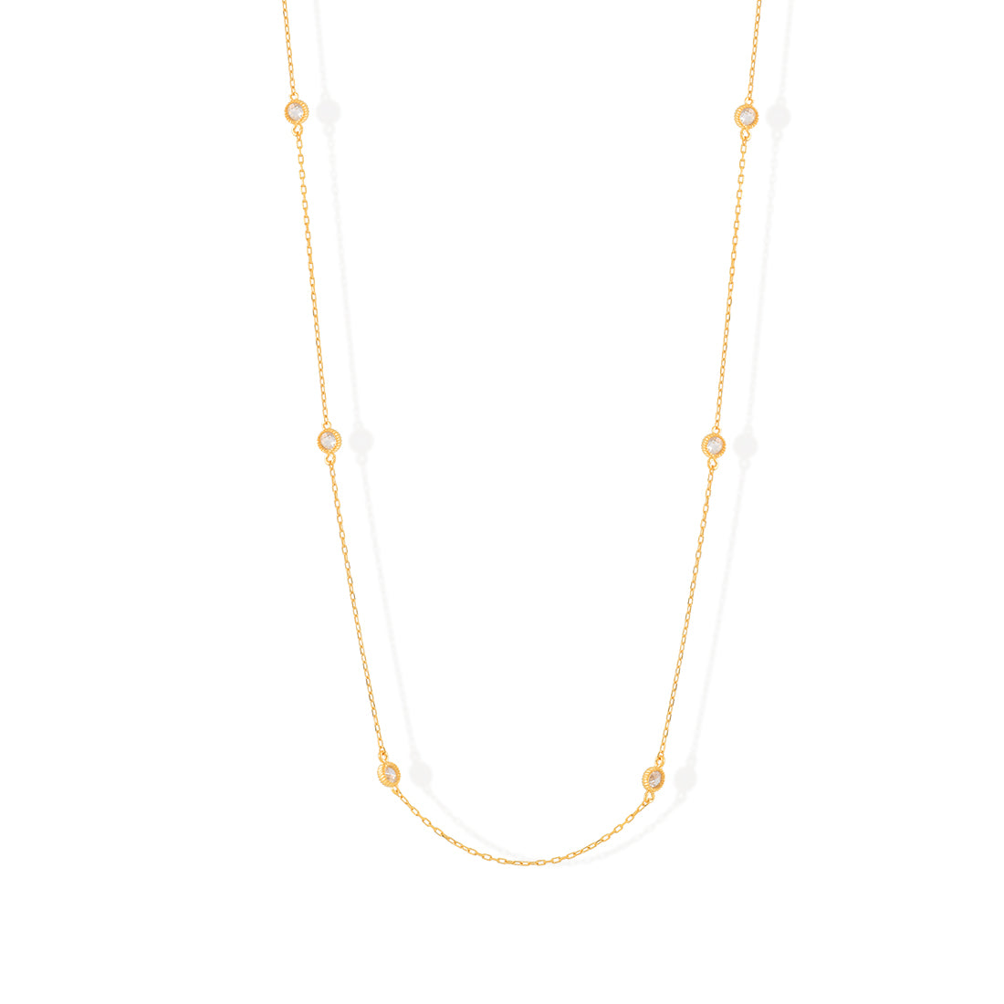 24K gullbelagt sølv, gull vermeil. lengde på kjedet er 43cm og pyntet med zirkonia.