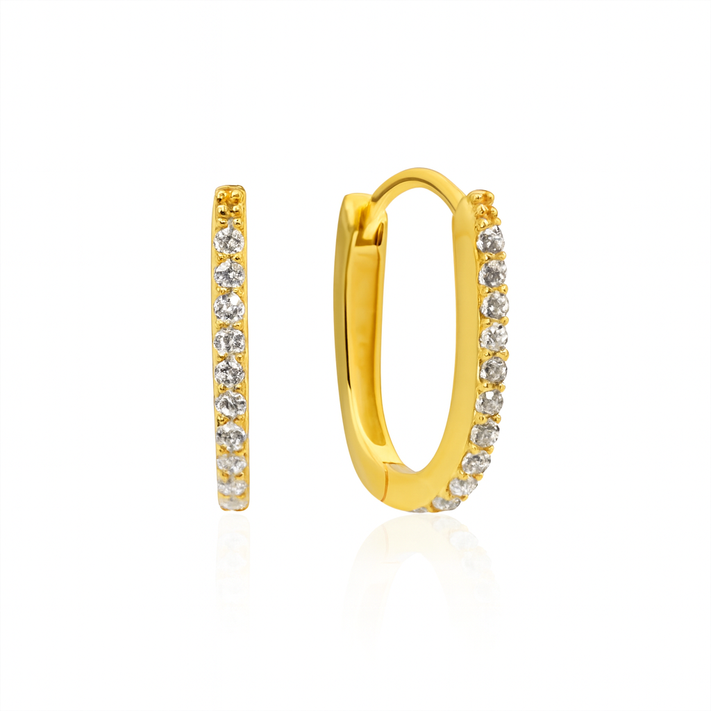 Elegante ovale hoops i sølv, belagt med et tykt lag 24K gull og pyntet med små klare zirkonia som gir et presist og mykt lys. Lengde 1,5 cm.